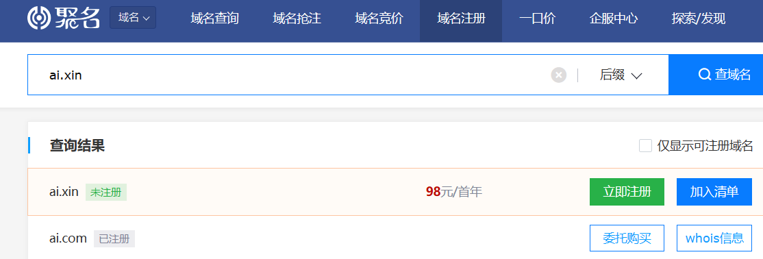 然后搜了a.xin 也可以注册 98元,只要98一年。